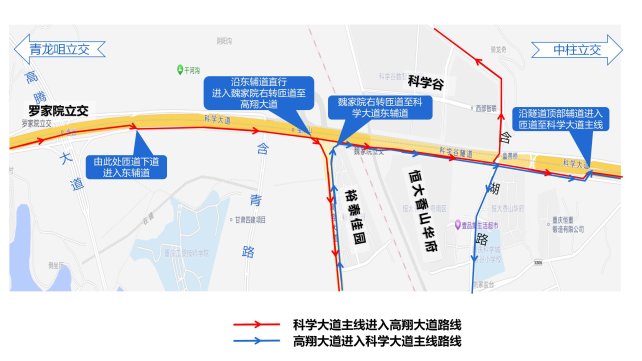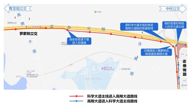 第二阶段交通组织调整:科学大道主线至高翔大道按照规划设计方案将关闭匝道口,主线行驶车辆可通过提前进入东辅道(由罗家院立交北侧匝道口下道至科学大道东辅道),后直行经右转进入高翔大道;高翔大道至科学大道主线,调整为由高翔大道右转进入科学大道东辅道,直行经科学谷隧道段上盖辅道行驶至北端洞口匝道进入科学大道主线。具体路线见下图所示。工程预计工期约15天,即2024年4月11日至2024年4月25日,完工后将一直按此方案组织交通。