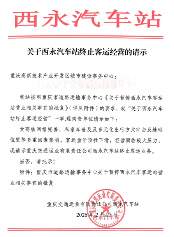 重庆交通运业有限责任公司西永汽车站根据企业经营情况,自愿申请终止客运站经营,于2026年4月20日正式停业。
