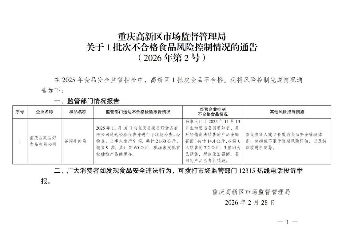 重庆高新区市场监督管理局关于1批次不合格食品风险控制情况的通告(2026年第2号)