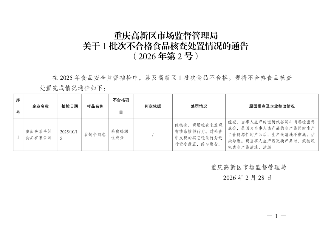 重庆高新区市场监督管理局关于1批次不合格食品核查处置情况的通告(2026年第2号)